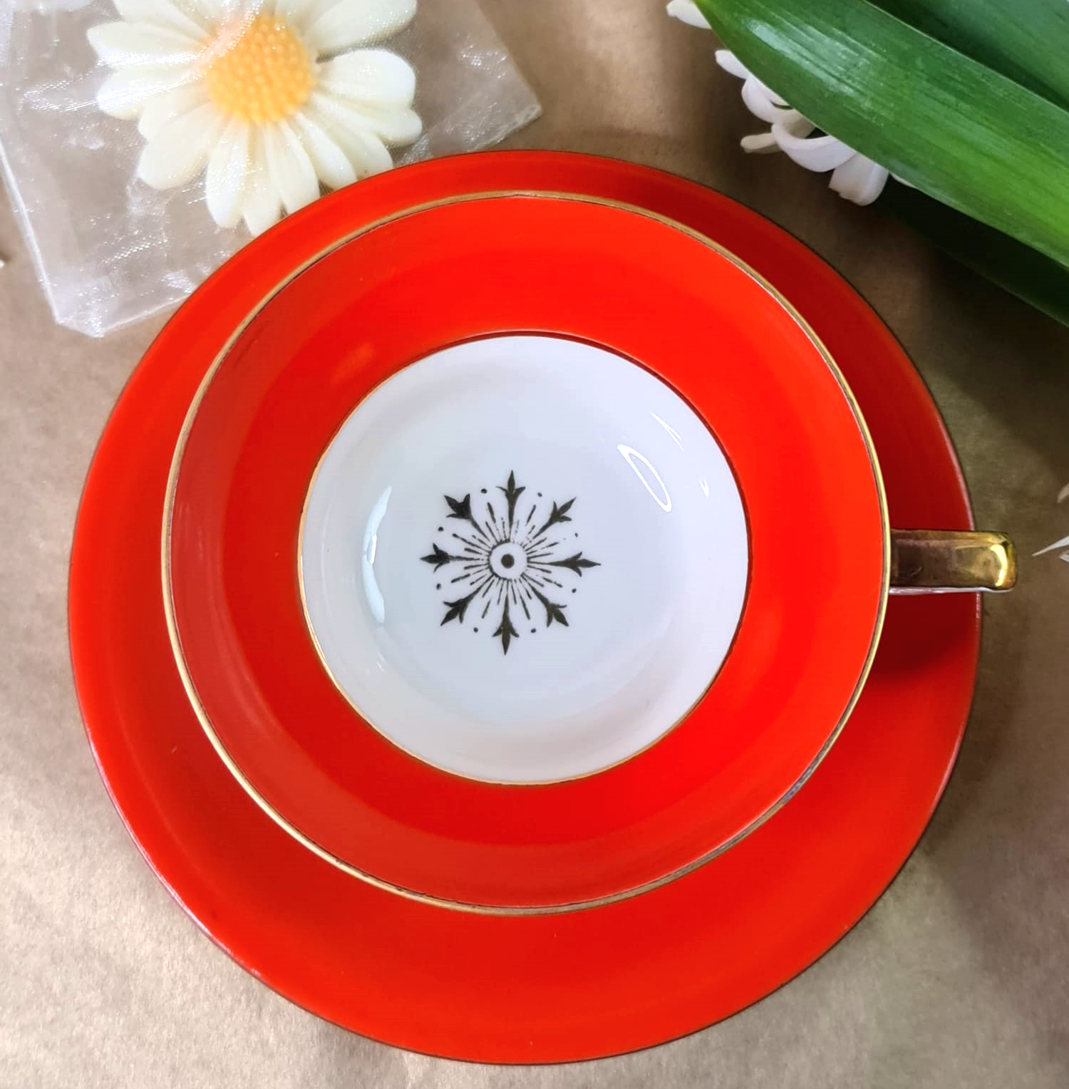 - O ceașcă de ceai, cu farfurie suport, din porțelan deosebit de fin și ușor, realizat manual, cu detalii aurite. Este un set marca Tuppack Tiefenfurt, Silezia, conform mărcii de identificare. În acea epocă, porțelanul fin era decorat cu aur, tocmai pentru a ridica valoarea pieselor și a le plasa în categoria superioară de lux. Porțelanul este fin ca mătasea, de culoarea untului, cu borduri late portocalii. Culorile sunt delimitate de linii aurii, baza ceștii, pe interior, fiind pictată cu un element stelar. Forma ceștii este de clopot, largă, cu baza pe patru piciorușe dantelate și marcate cu linii de aur. Toarta ceștii este deosebită, unghiulară, aurită pe partea superioară.