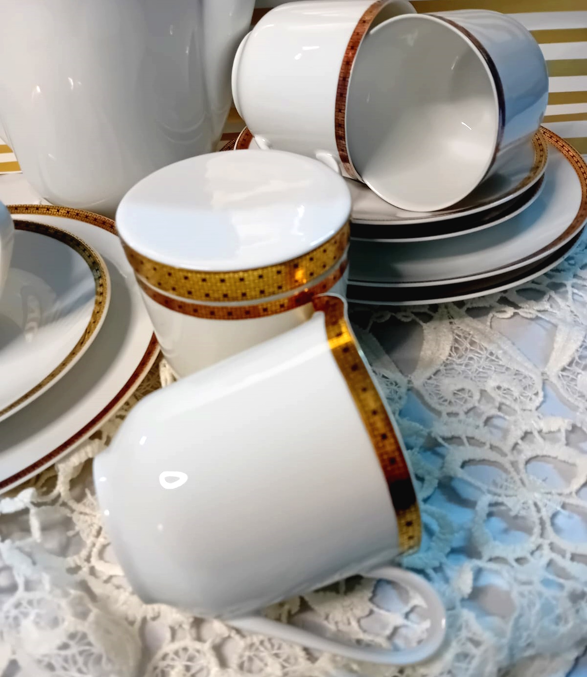 - Ceainic elegant, cu linii clasice, din porțelan deosebit de fin, care lasă senzația de mătase, la atingere. Porțelanul alb este decorat cu o bordură aurită și desene geometrice, din linii fine, negre. Clasic, atemporal, acest serviciu pentru ceai îți creează impresia că a fost creat ieri, atât este de modern și de frumos, păstrat într-o stare impecabilă. Ceainicul are un capac cilindric, model deosebit de rar pentru serviciile de ceai ale anilor 50-60.