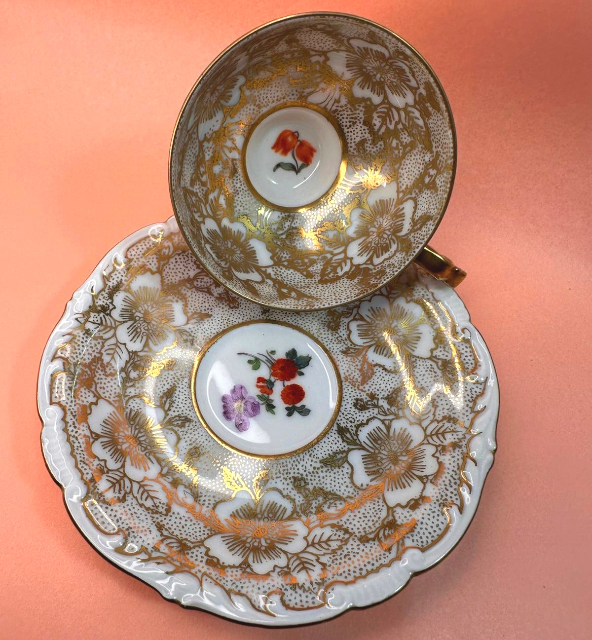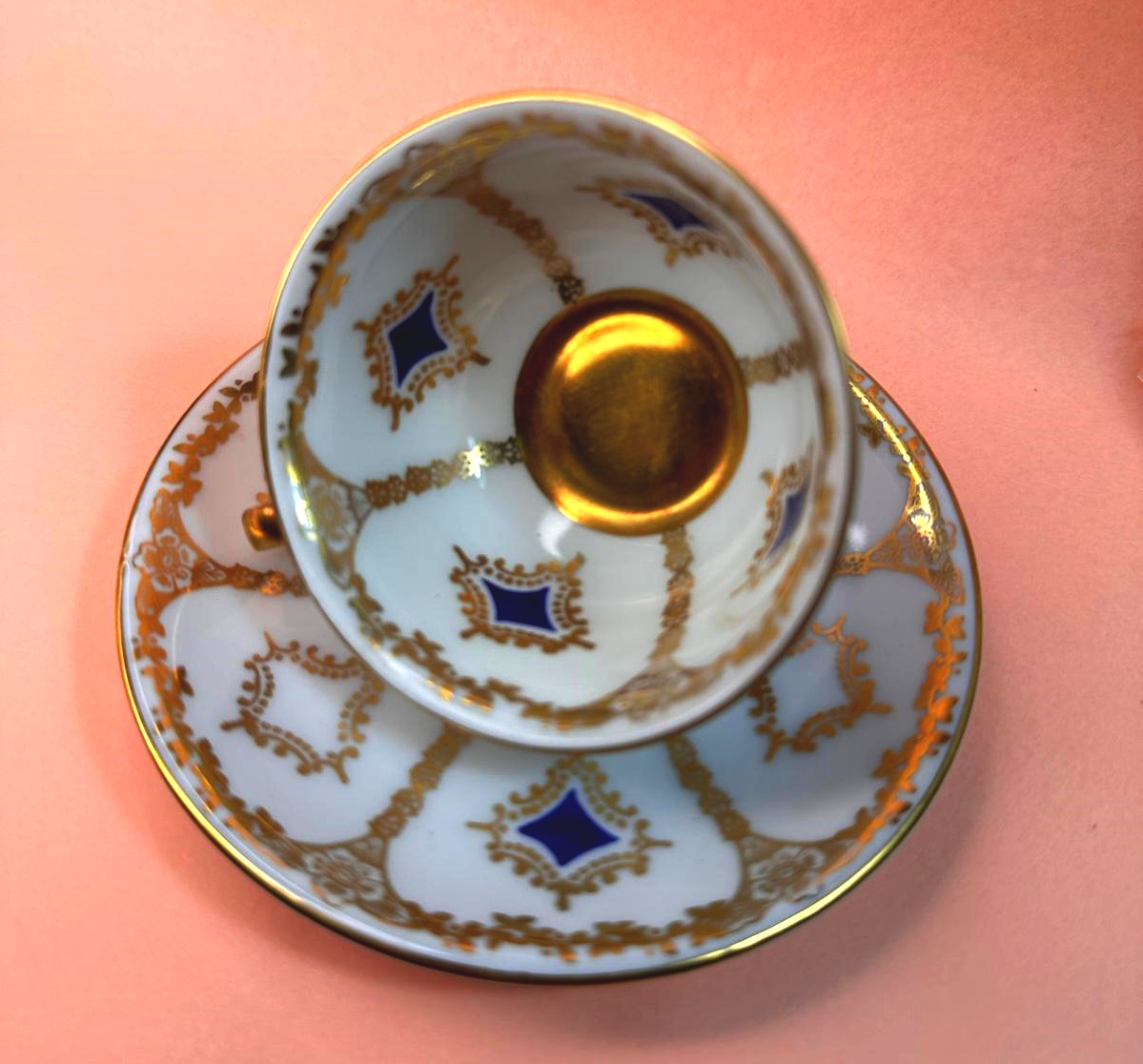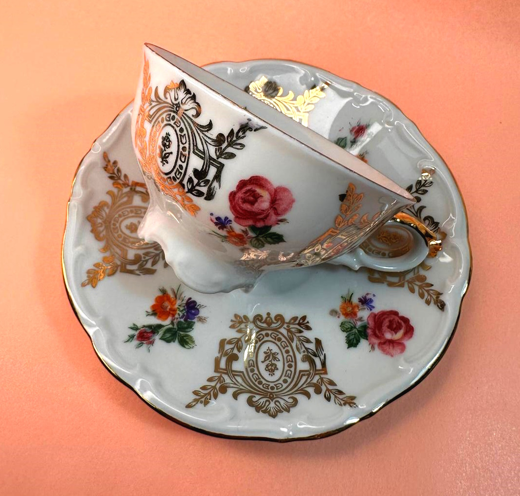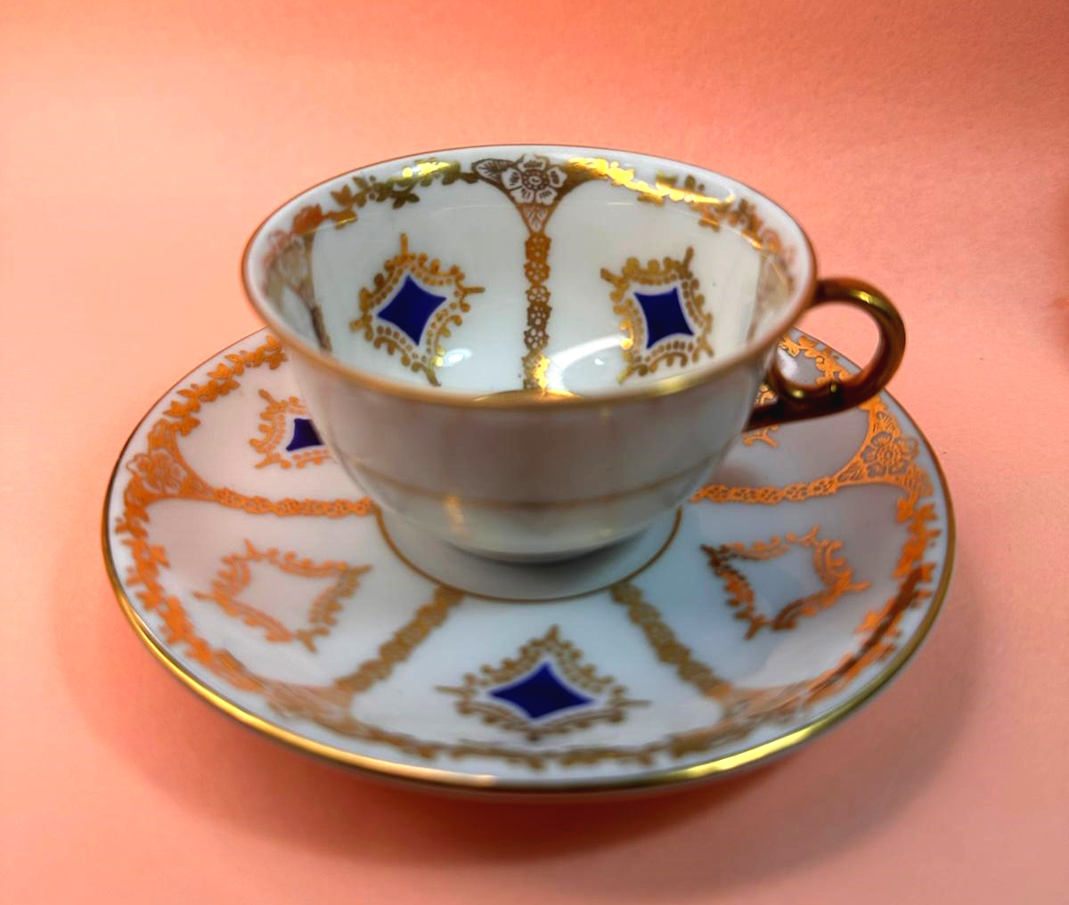 - Set pentru cafea scurtă, din porțelan fin bavarez, din anii 1920 – 1960, decorat cu aur și pictat manual. Porțelanul este deosebit de fin, ușor și translucid, atunci când este pus în lumină. Acestea sunt caracteristici ale porțelanului de înaltă calitate, așa cum astăzi nu se mai fabrică, preferat fiind stilul minimalist, greoi și ieftin. Setul este format din o ceașcă și farfuria suport pentru ceașcă.