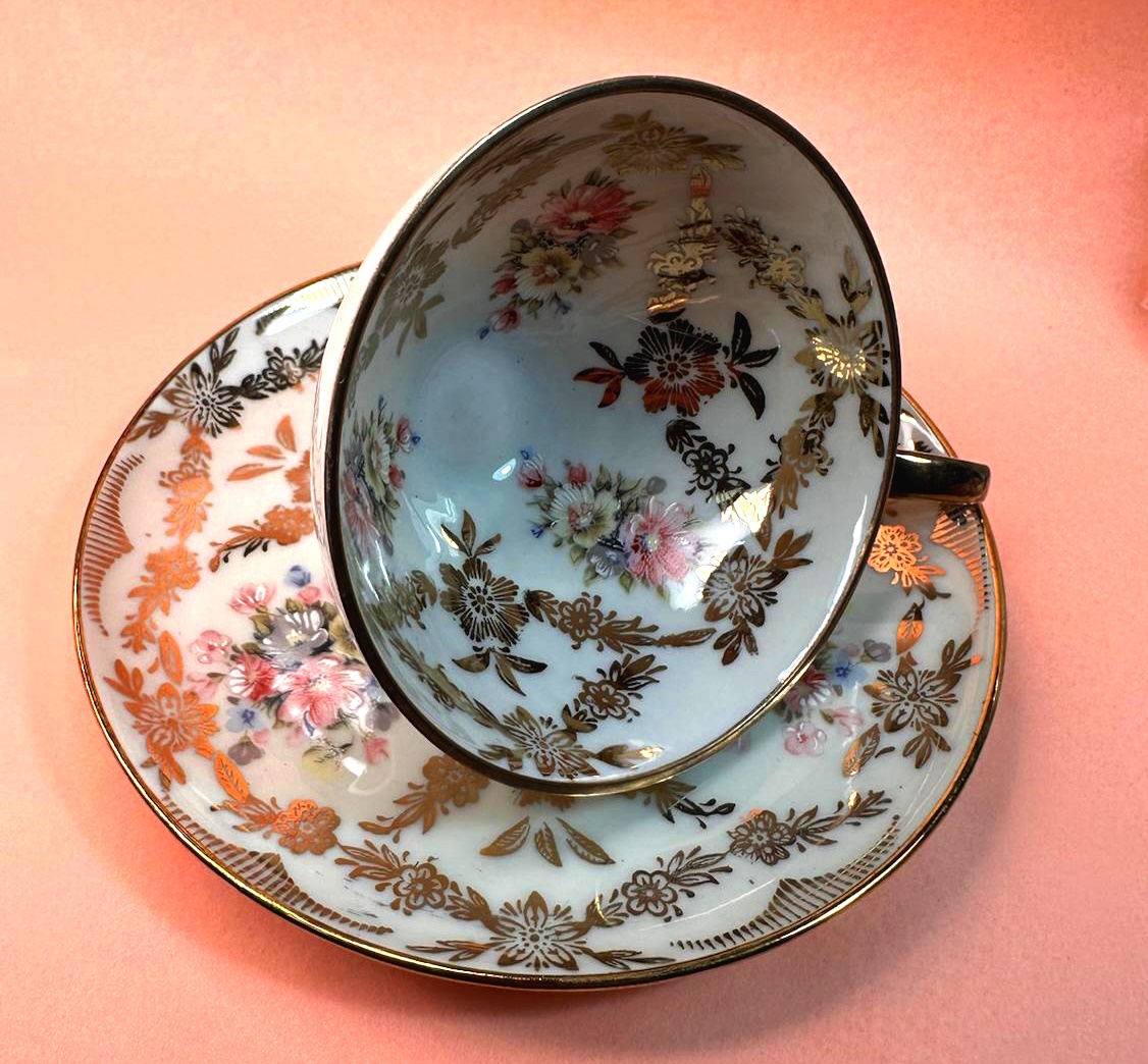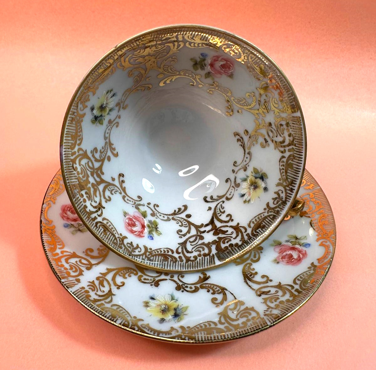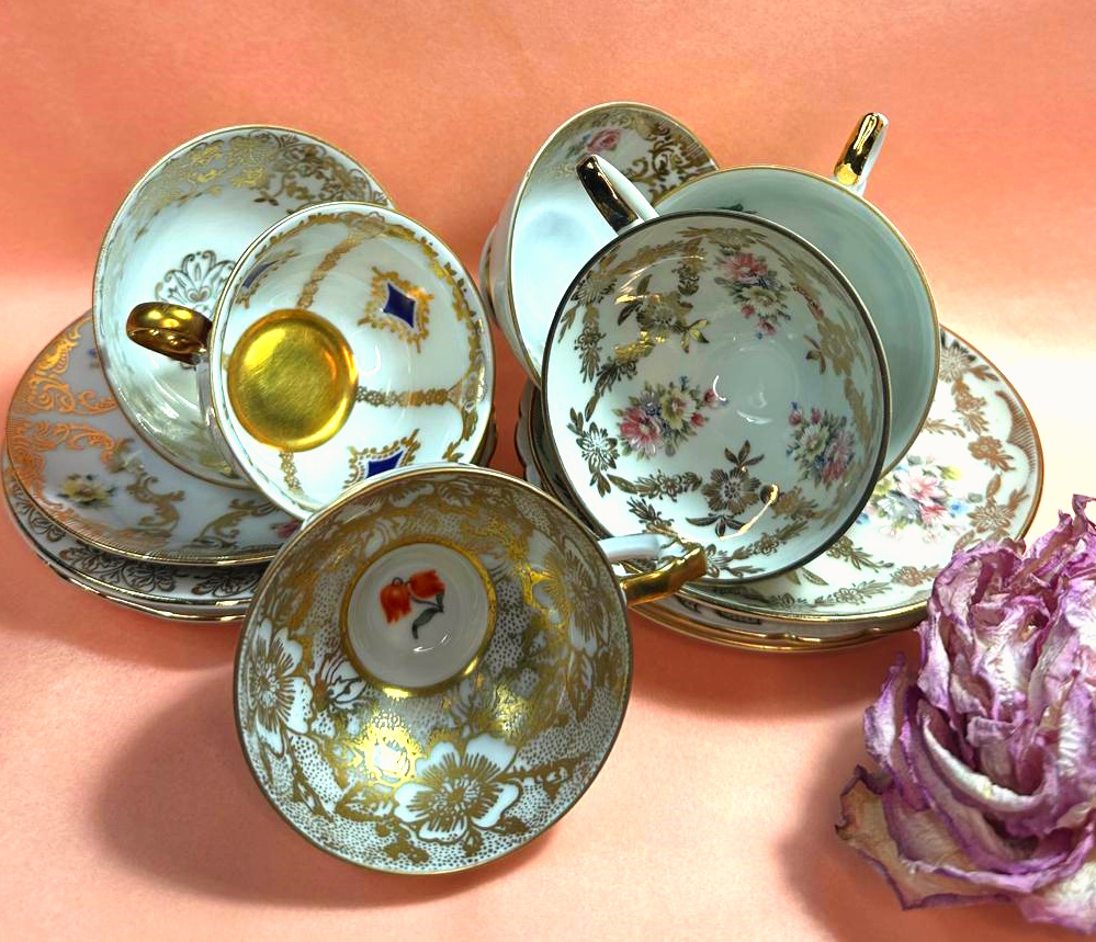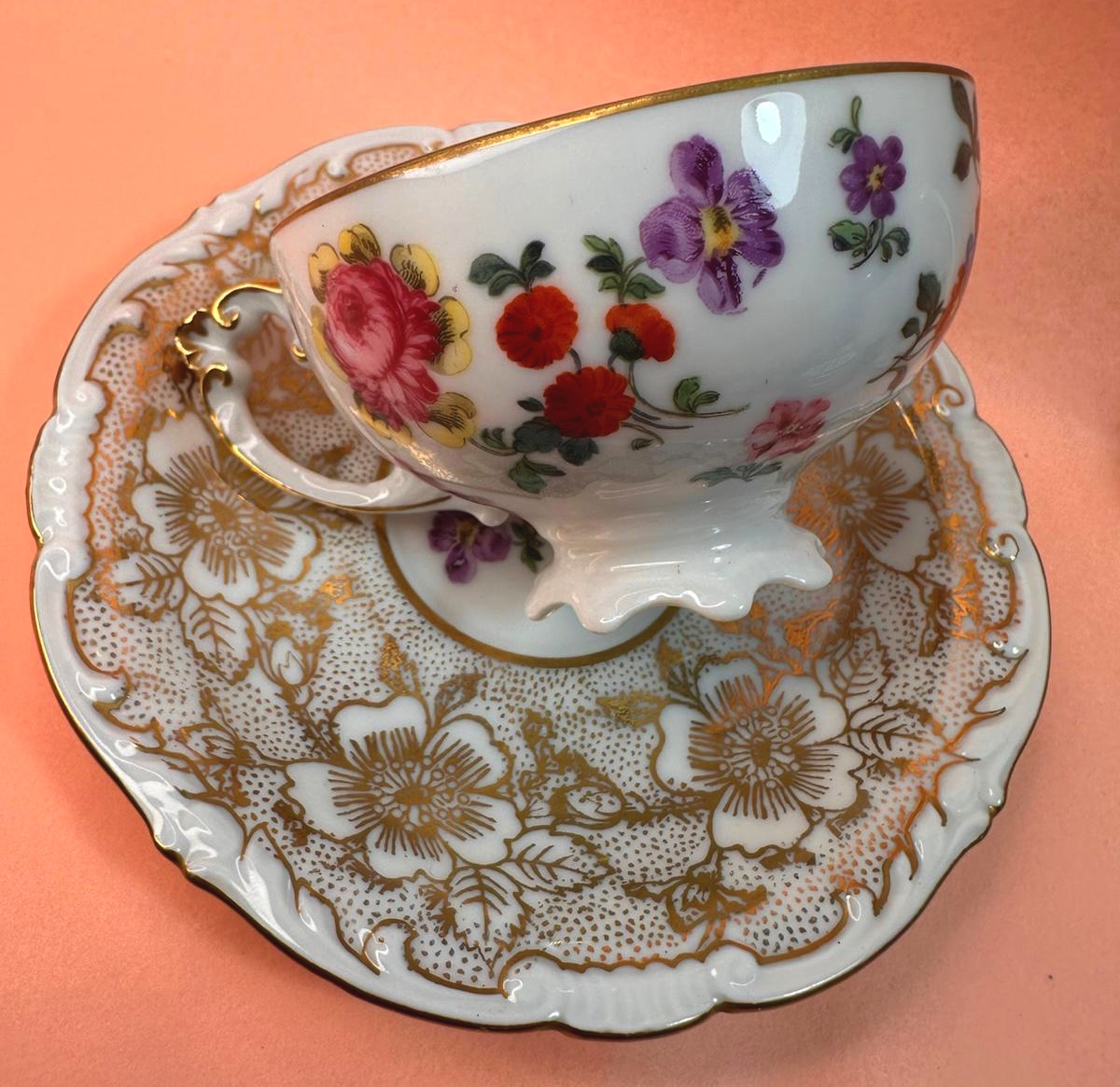 - Set pentru cafea scurtă, din porțelan fin bavarez, din anii 1920 – 1960, decorat cu aur și pictat manual. Porțelanul este deosebit de fin, ușor și translucid, atunci când este pus în lumină. Acestea sunt caracteristici ale porțelanului de înaltă calitate, așa cum astăzi nu se mai fabrică, preferat fiind stilul minimalist, greoi și ieftin. Setul este format din o ceașcă și farfuria suport pentru ceașcă.