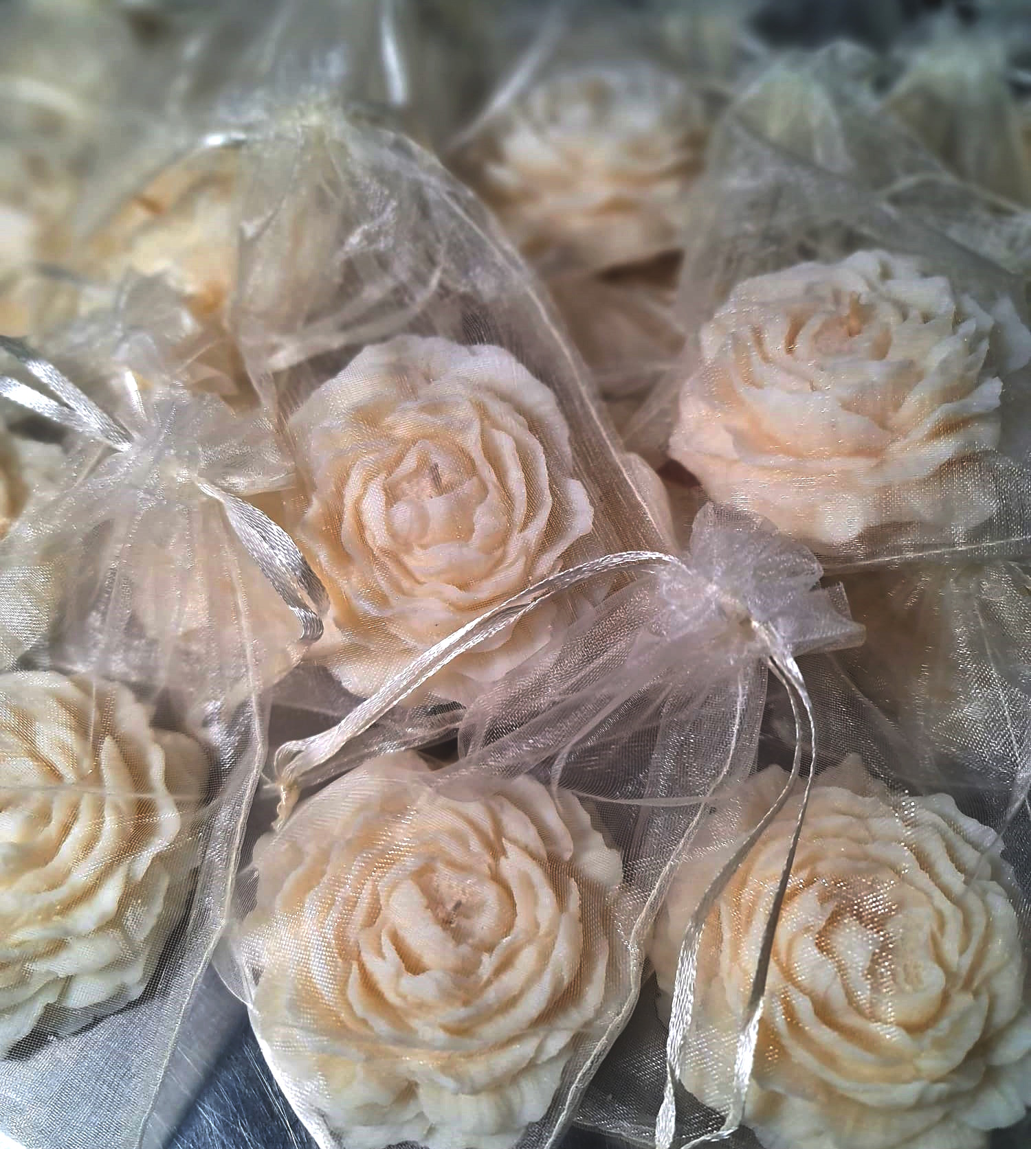 Lumânarea bujor este ambalată în săculeț din organza albă.